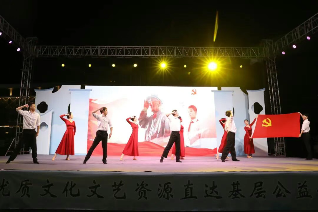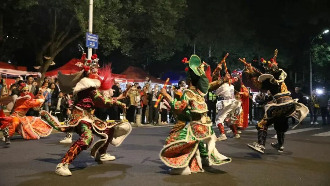 演出尚未启幕,明溪县城已洋溢着浓厚的欢乐氛围——英歌舞队伍身着特色服饰沿街巡游,刚劲的舞姿、热烈的节奏引得路人驻足喝彩。当“七彩祥云”烟花秀在夜空绚烂绽放,主题专场演出在舞蹈《铮铮誓言铭初心》的动人旋律中正式拉开帷幕。