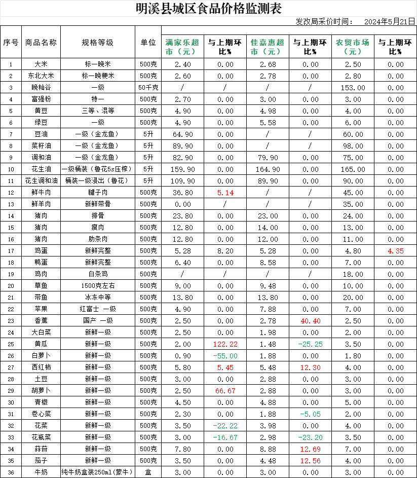 明溪县城区食品价格监测表(2024年5月21日)