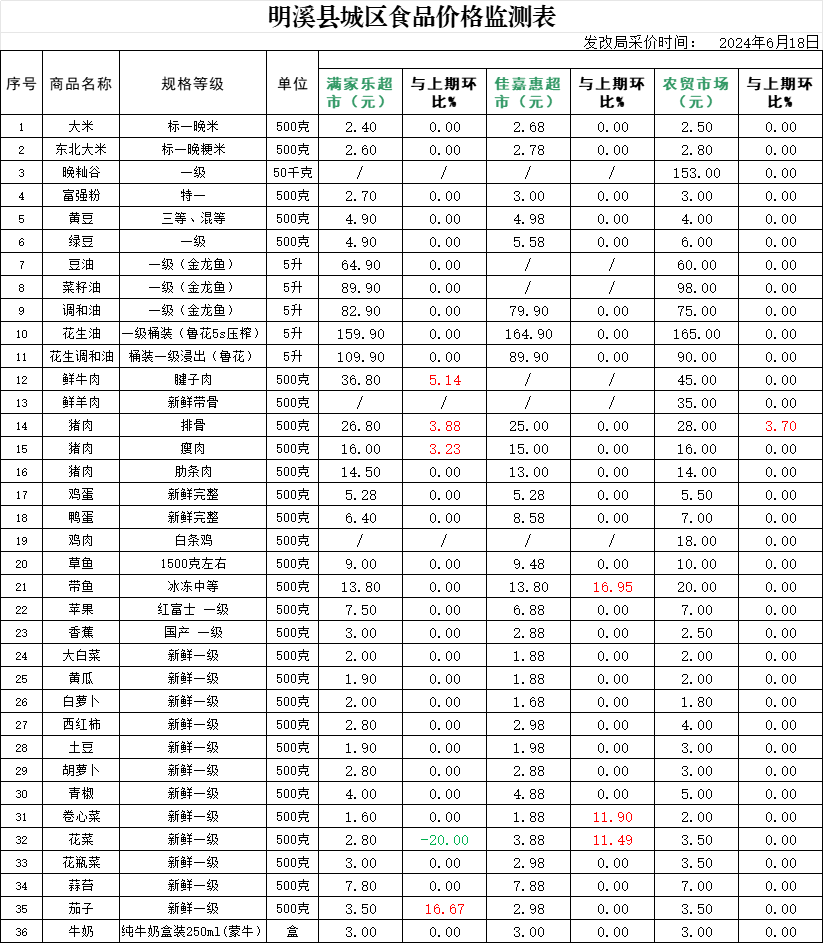 明溪县城区食品价格监测表(2024年6月18日)