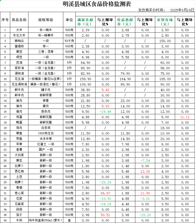 明溪县城区食品价格监测表 (2025年9月16日)