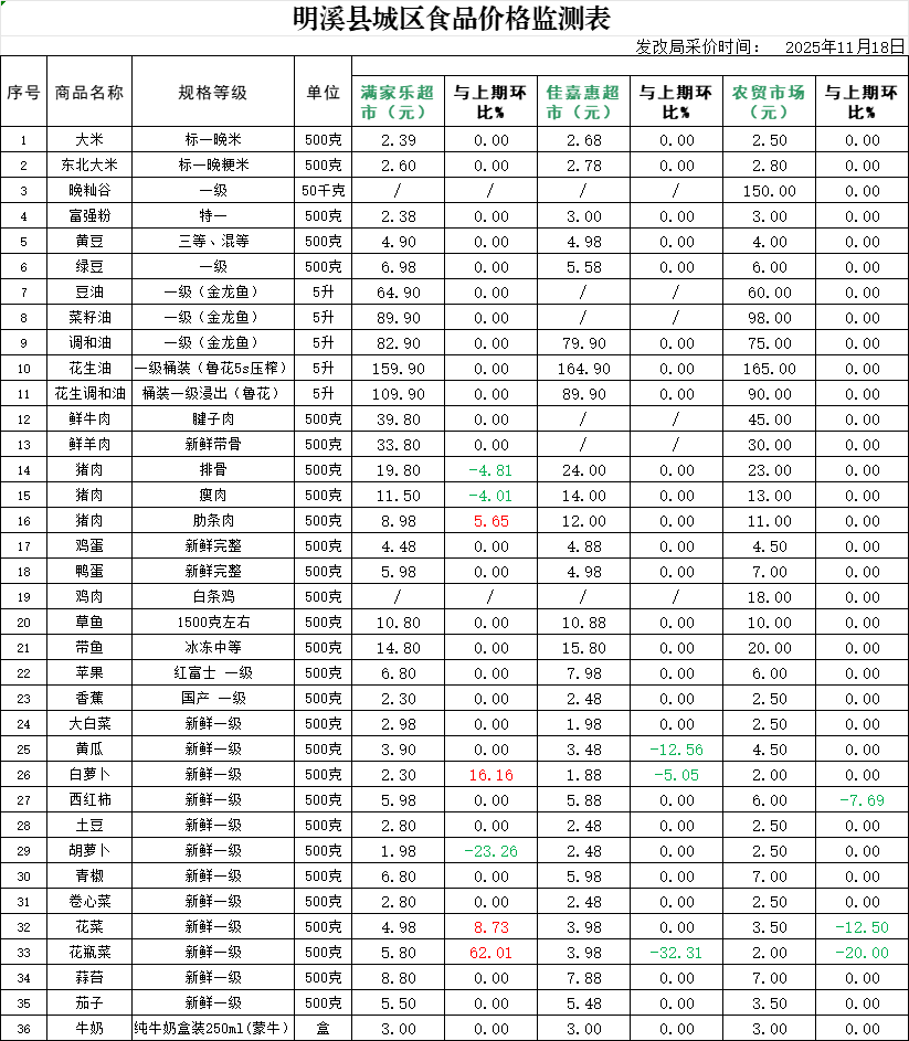 明溪县城区食品价格监测表 (2025年11月18日)