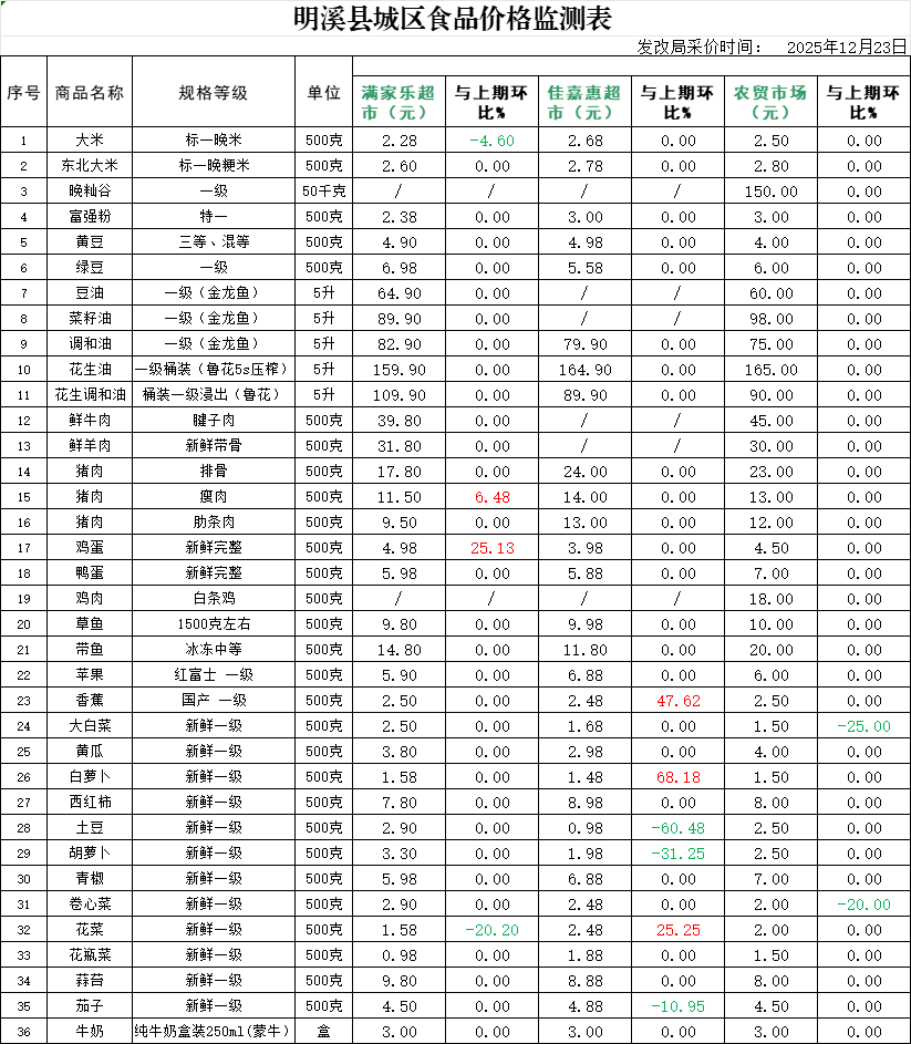 明溪县城区食品价格监测表(2025年12月23日)