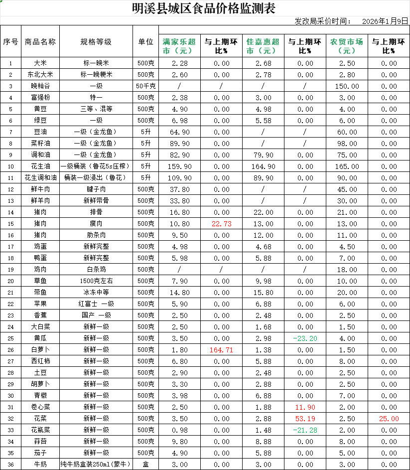 明溪县城区食品价格监测表 (2026年1月9日)