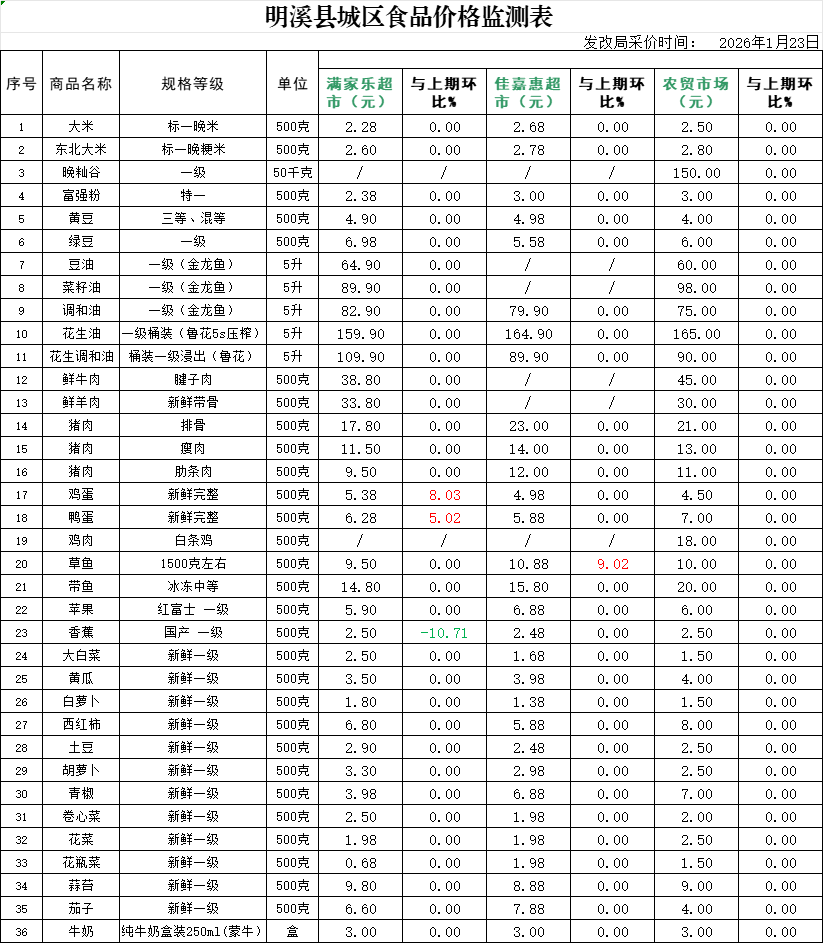 明溪县城区食品价格监测表 (2026年1月23日)