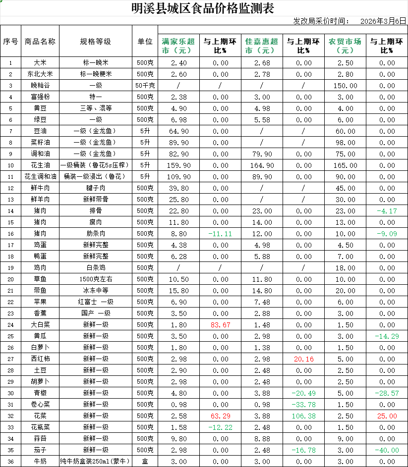 明溪县城区食品价格监测表(2026年3月6日)
