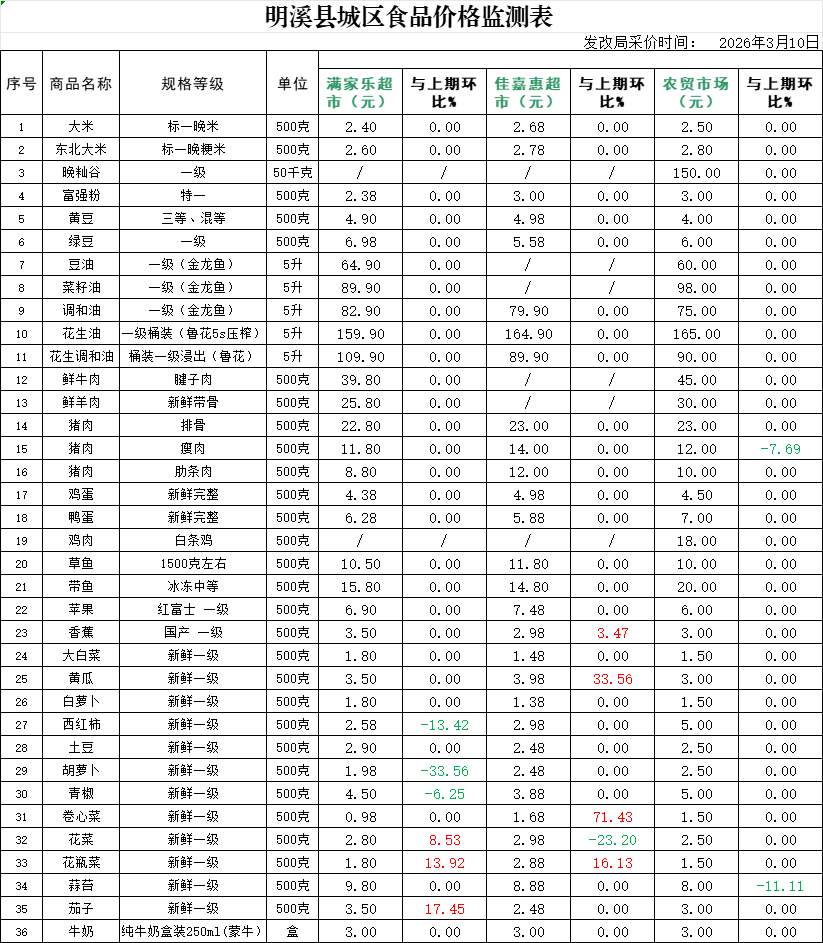 明溪县城区食品价格监测表 (2026年3月10日)