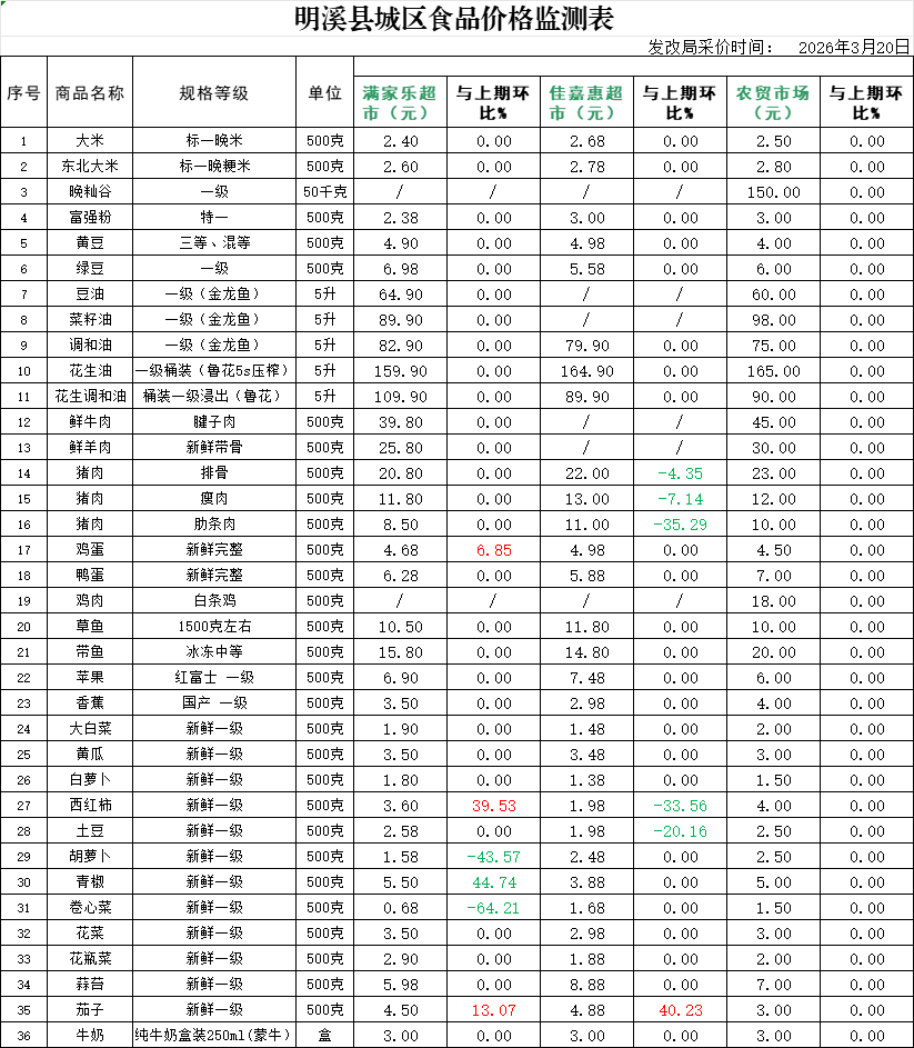 明溪县城区食品价格监测表(2026年3月20日)