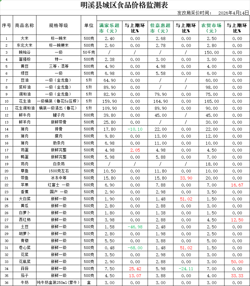 明溪县城区食品价格监测表 (2026年4月14日)