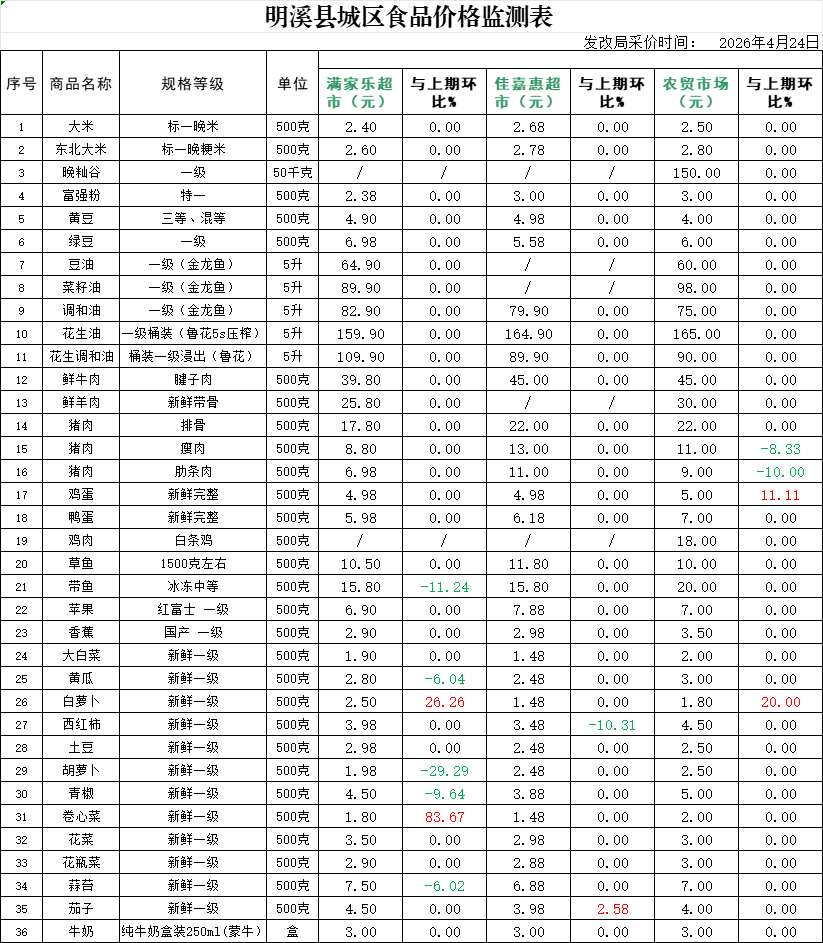 明溪县城区食品价格监测表 (2026年4月24日)