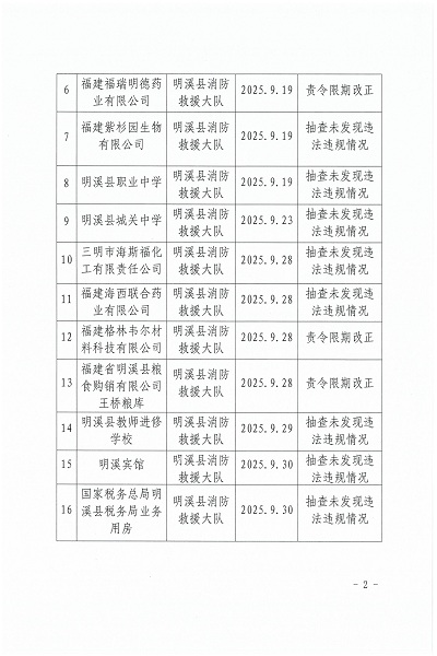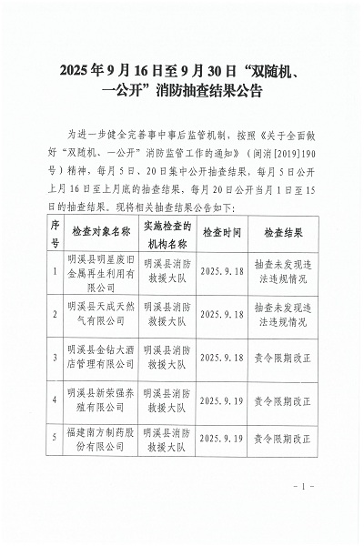 2025年9月16日至月30日“双随机、一公开”消防抽查结果公告