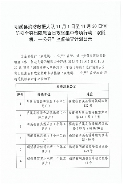 11月1日至11月30日消防安全突出隐患百日攻坚集中专项行动“双随机、一公开”消防监督抽查计划