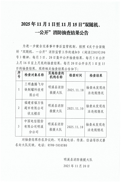2025年11月1日至11月15日“双随机、一公开”消防抽查结果公告