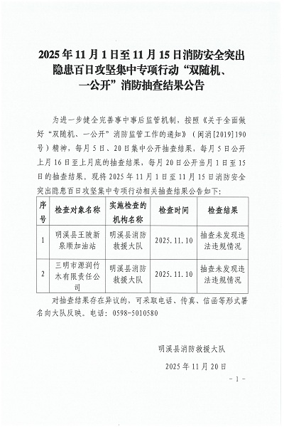 2025年11月1日至11月15日消防安全突出隐患百日攻坚集中专项行动“双随机、一公开”消防抽查结果公告
