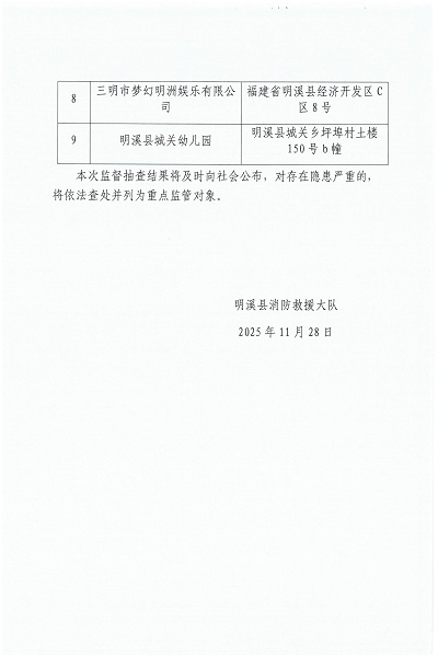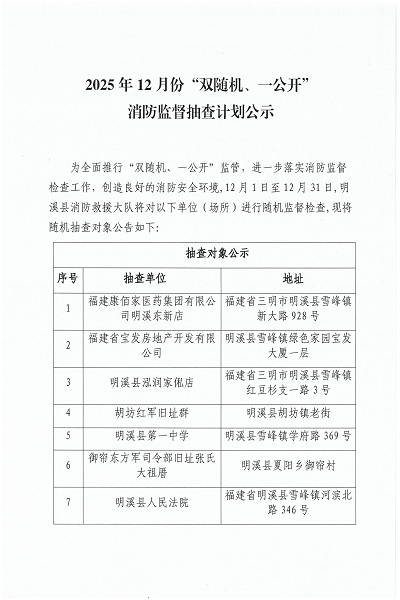 2025年12月份“双随机、一公开”消防监督抽查计划公示