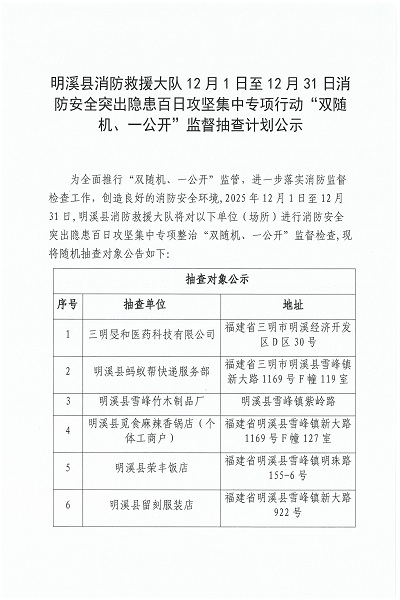 12月1日至12月31日消防安全突出隐患百日攻坚集中专项行动“双随机、一公开”监督抽查计划公示