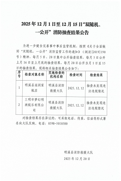 2025年12月1日至12月15日“双随机、一公开”消防抽查结果公告