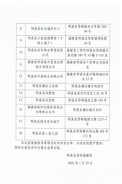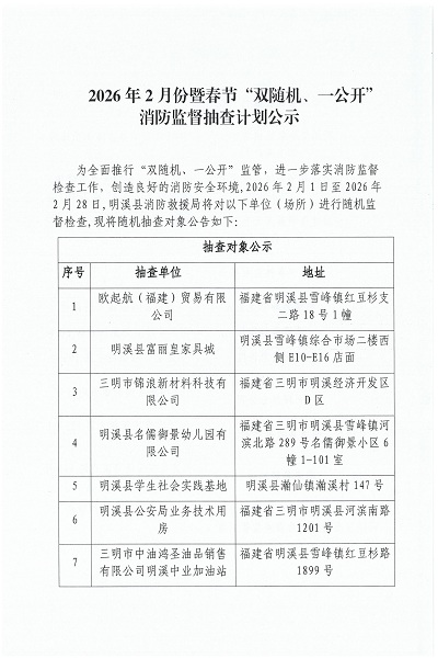 2026年2月份暨春节“双随机、一公开”消防监督抽查计划公示