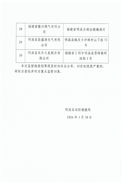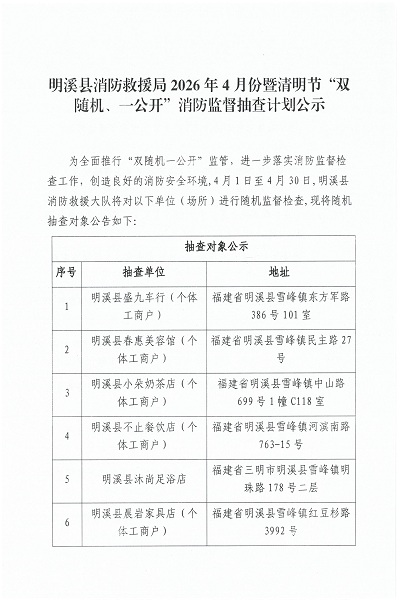 明溪县消防救援局2026年4月份暨清明节“双随机、一公开”消防监督抽查计划公示