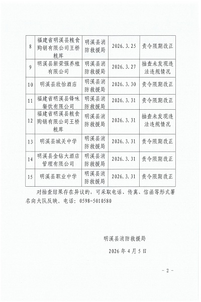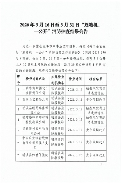 2026年3月16日至3月31日“双随机、一公开”消防抽查结果公告
