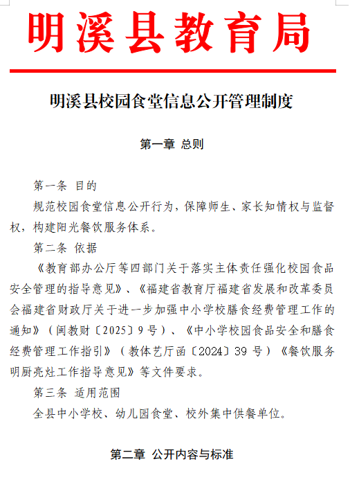 为进一步加强校园食品安全与膳食经费管理,县教育局聚焦校园食品安全食材采购、食材加工、分餐用餐、膳食经费管理等关键环节,健全相关制度,实现以制度建设推动闭环管理。本期展示《明溪县校园食堂信息公开管理制度》。