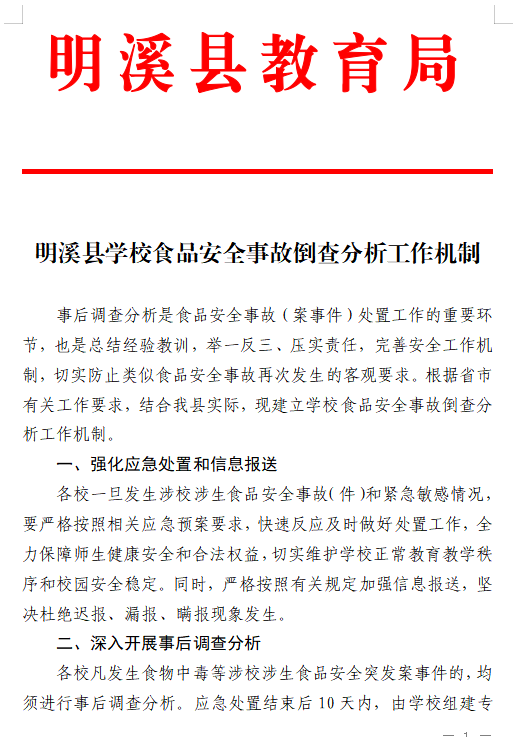 为进一步加强校园食品安全与膳食经费管理,县教育局聚焦校园食品安全食材采购、食材加工、分餐用餐、膳食经费管理等关键环节,健全相关制度,实现以制度建设推动闭环管理。本期展示《明溪县学校食品安全事故倒查分析工作机制》。