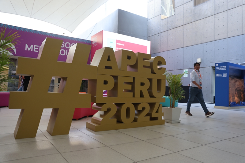 11月13日,人们从秘鲁首都利马会议中心外的2024年亚太经济合作组织(APEC)会议标识前走过。新华社发(玛丽安娜·巴索 摄)