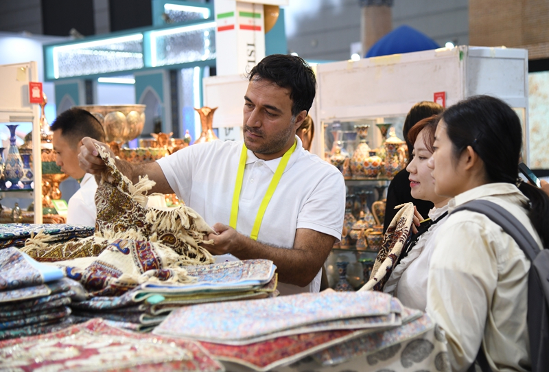 2024年9月20日,在陕西省西安市举行的第八届丝绸之路国际博览会上,来自伊朗的参展商(前左一)向观众介绍产品。新华社记者 张博文 摄