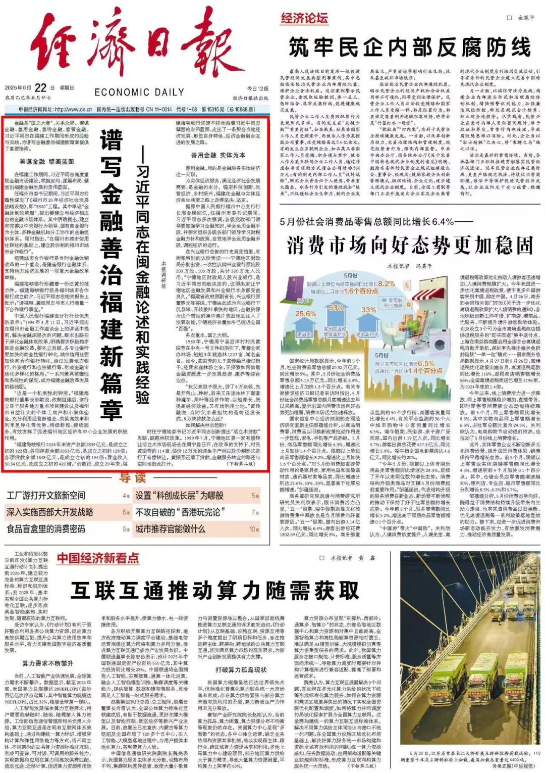 6月22日,《经济日报》头版头条刊发《谱写金融善治福建新篇章——习近平同志在闽金融论述和实践经验》。