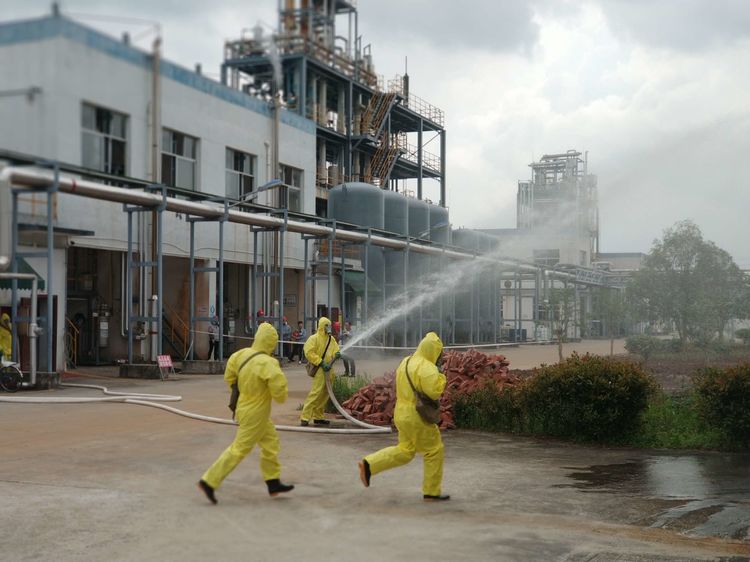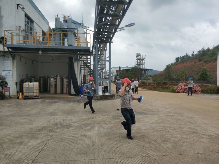 演练现场,仓管员安全巡查时发现氟化氢仓库报警器响起,检查发现氟化氢钢瓶阀芯泄漏,立即向安全环保部通报情况,接到报告后公司启动厂级响应,展开应急抢险。由疏散组引导泄漏污染区周边人员疏散至安全地带;警戒组拉起警戒线封锁事故现场区域,进行隔离;保障组迅速将消防水带(4根)、水枪、防化服等应急材料运到事故现场;抢险组佩戴好防护用具,进入现场,先对泄漏区域使用雾状水喷淋,然后使用钢瓶专用铜螺帽堵漏。