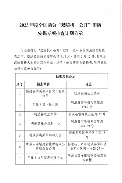 2023年度全国两会“双随机、一公开”消防安保专项抽查计划公示