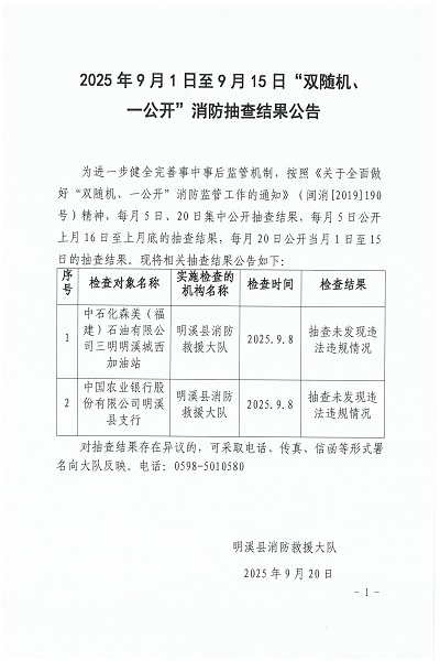 2025年9月1日至9月15日“双随机、一公开”消防抽查结果公告