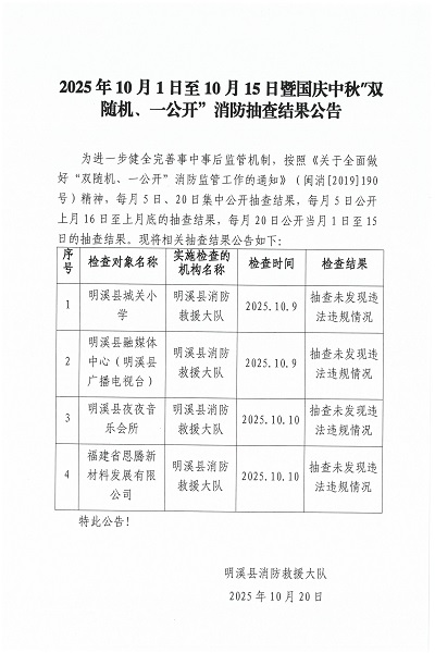2025年10月1日至10月15日暨国庆中秋“双随机、一公开”消防抽查结果公告