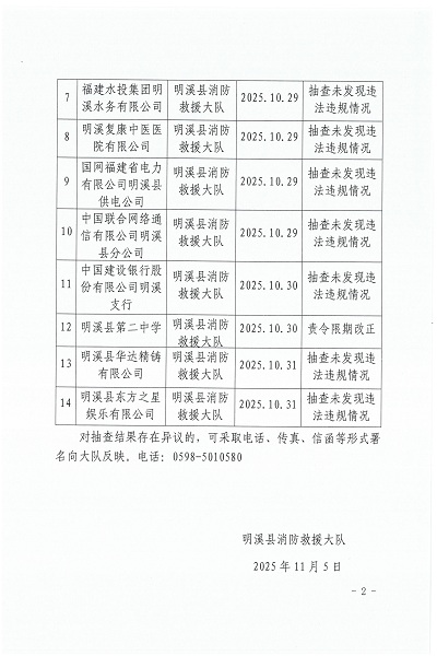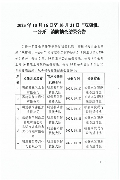 2025年10月16日至10月31日“双随机、一公开”消防抽查结果公告