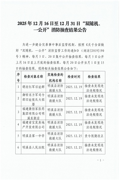 2025年12月16日至12月31日“双随机、一公开”消防抽查结果公告