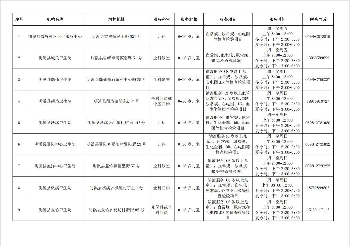为方便儿童就近享受诊疗服务,现将明溪县截至2025年10月可提供儿科诊疗服务的9家基层医疗卫生机构名单公布如下: