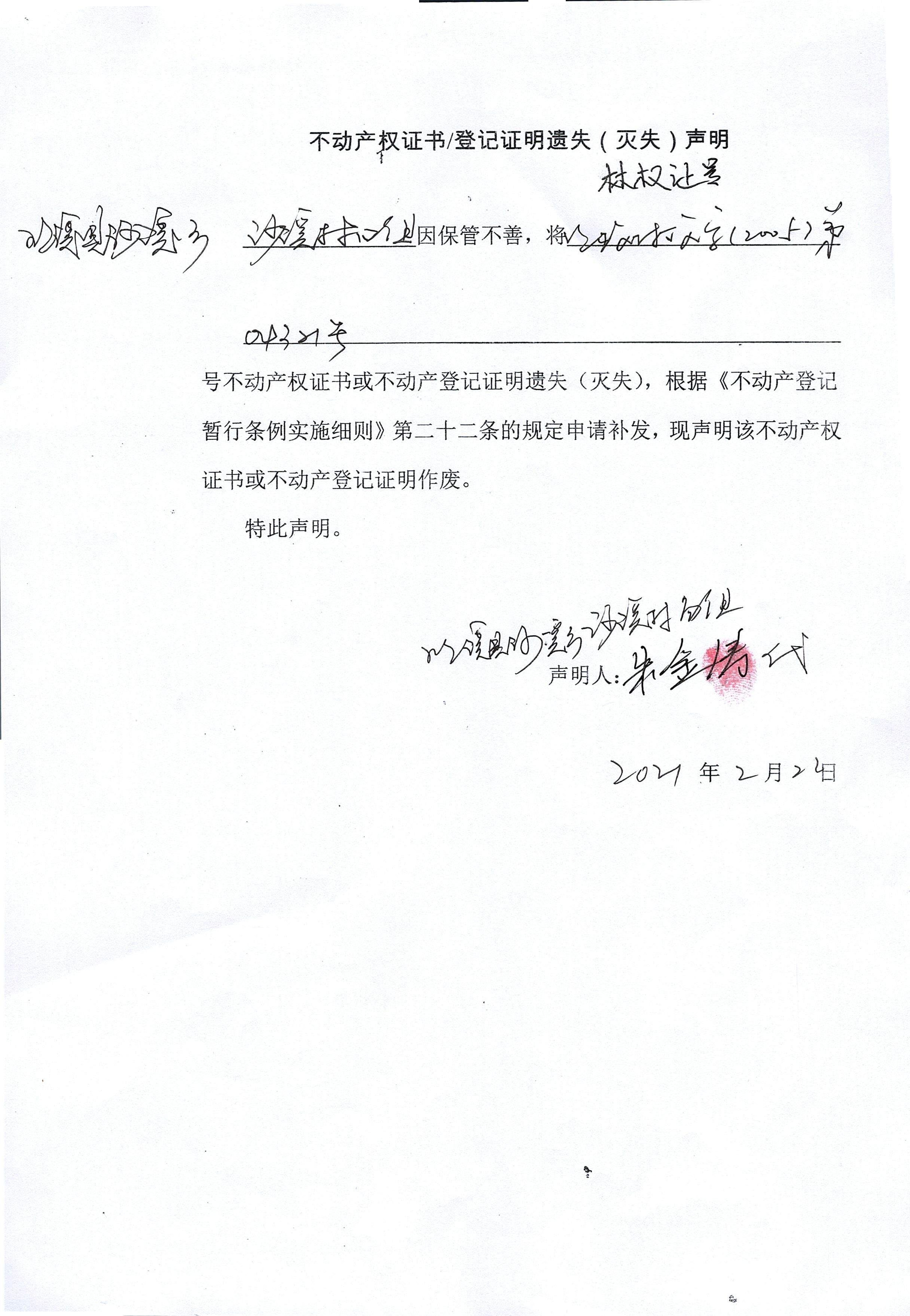 不动产权证书/登记证明遗失(灭失)声明 沙溪乡沙溪村
