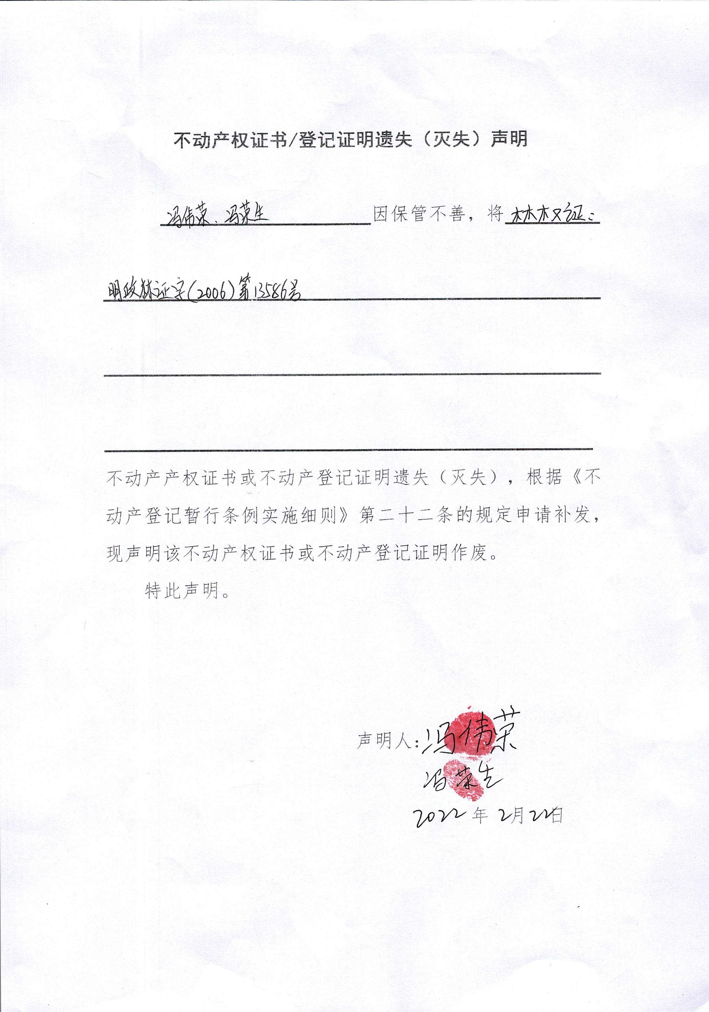 不动产权证书/登记证明遗失(灭失)声明 冯伟荣、冯荣生