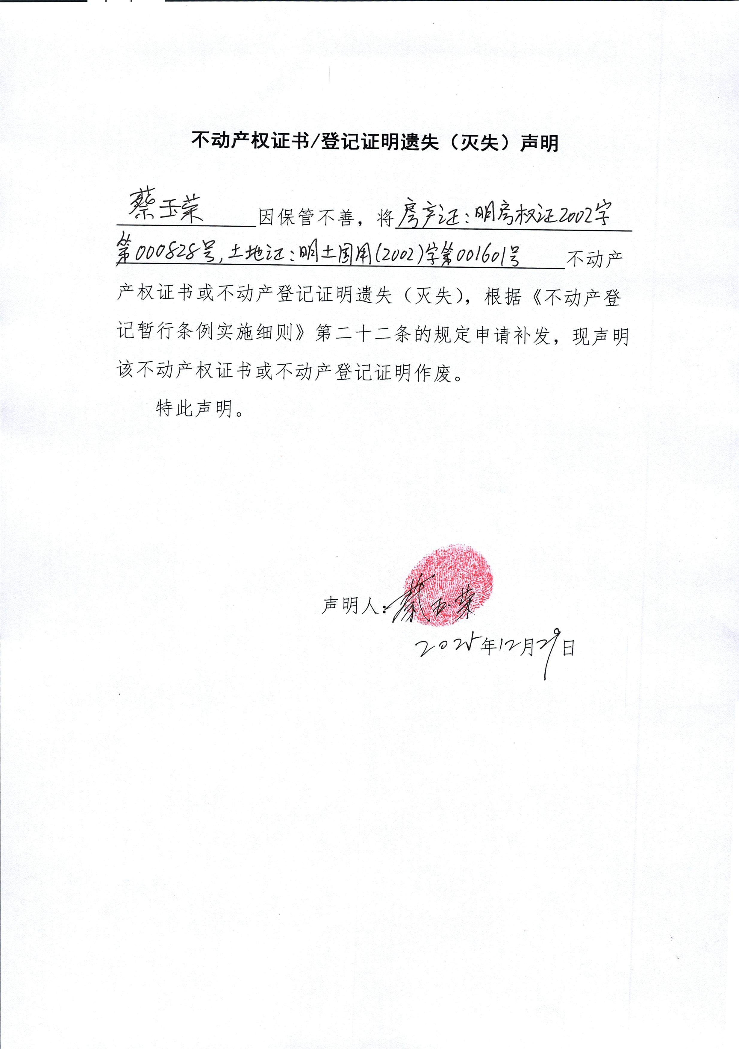 不动产权证书/登记证明遗失(灭失)声明