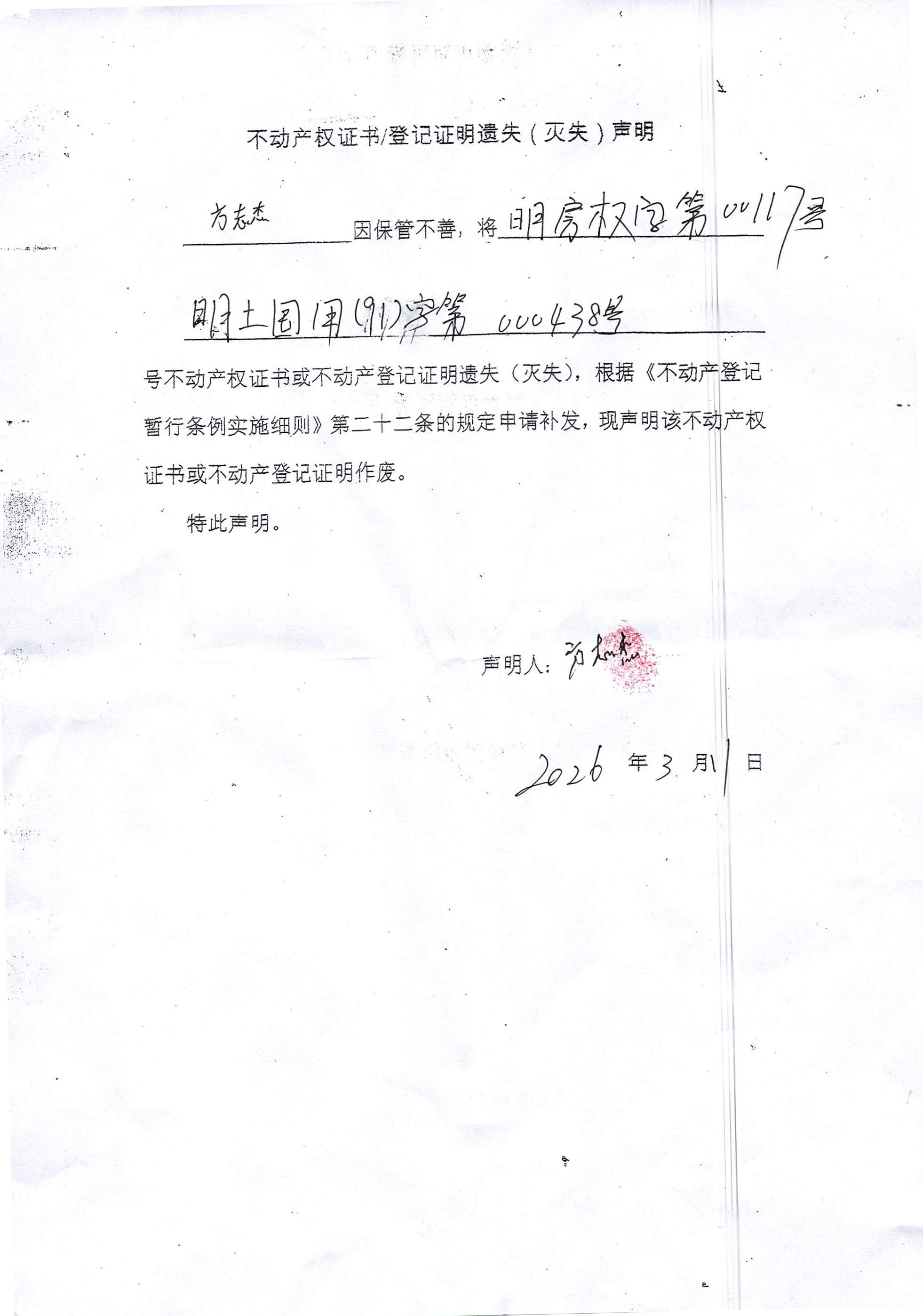 不动产权证书/登记证明遗失(灭失)声明